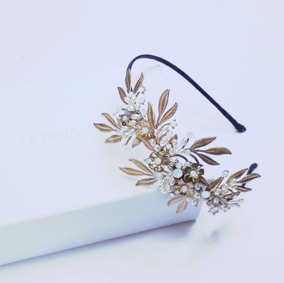 A beautiful grecian style gold coloured headdress with sprigs of pearl beads and Swarovski Opal stones in varying sizes.