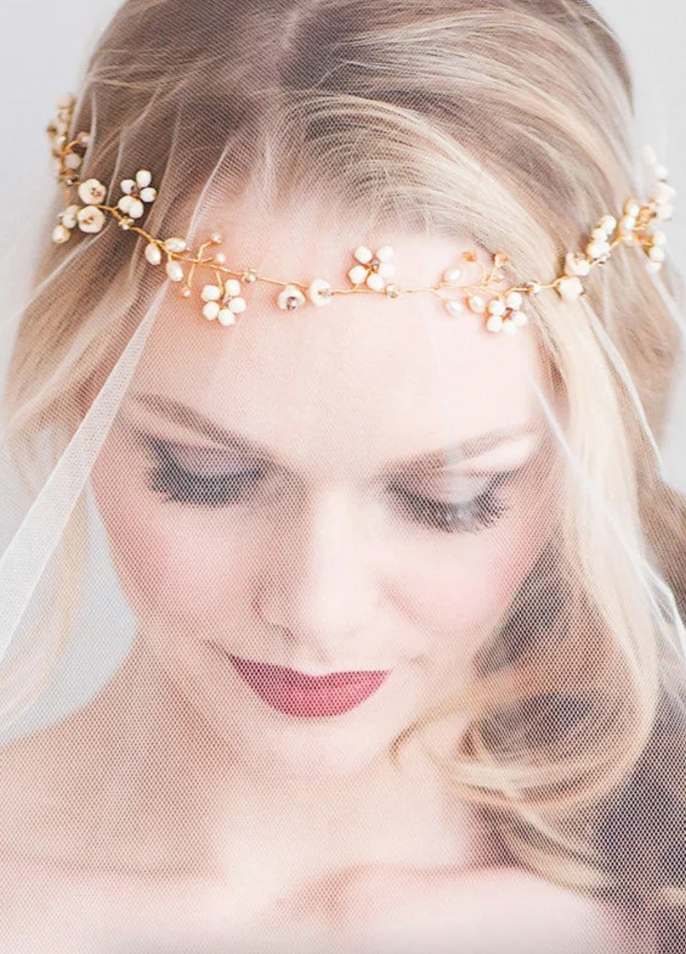 An exquisite gold coloured hair vine that can be worn in countless ways. Style your hair and shape your hair vine piece around an elegant up-do, on the forehead or a little further back on your head. Try twisting the hair vine around a plait to look like little flowers scattered through your hair. Secured with loops at either end with grips.