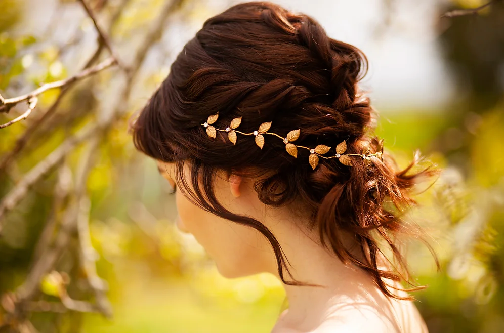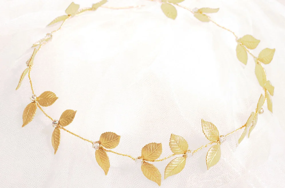 A beautiful botanical hair vine designed with detailed gold leaves and Swarovski crystal stones that provide a subtle sparkle. Available in half and full hair vine.